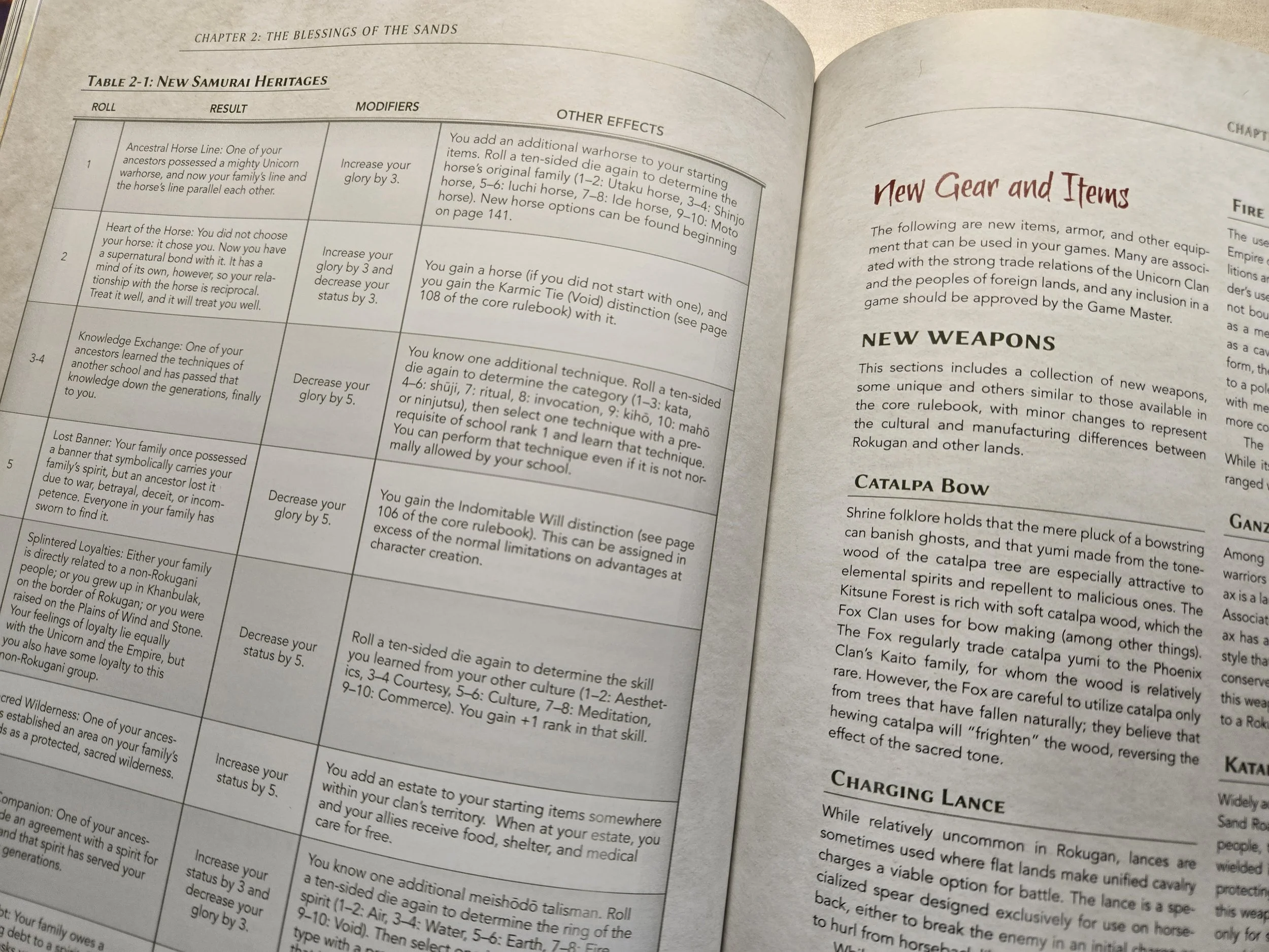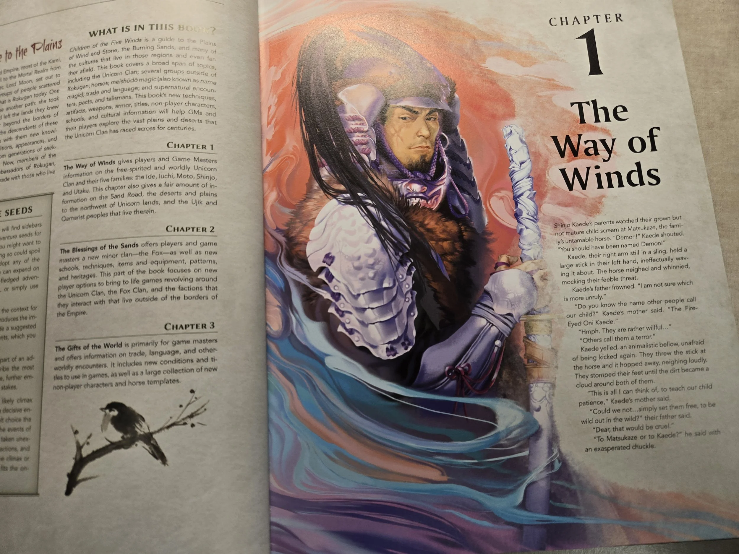 Having said all of that, I feel like the best part of this book is the fiction that is sprinkled throughout the book. I've read many of the short stories/novels that have come out in the L5R setting and they never disappoint. Especially in this book, which uses the Unicorn clan to talk about the areas outside of Rokugan. The first chapter of the book, which takes up almost half of the page count, is detailed with all kinds of information not just on the Unicorn Clan, but the other nations that are close to Rokugan. I've read other setting books that read like encyclopedias, dumping a bunch of "facts" on the reader that make my eyes glaze over. But the worldbuilding in the various stories help keep you engaged and provide context for all of the information that follows.